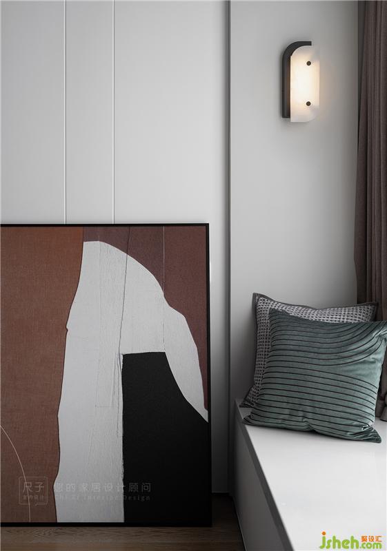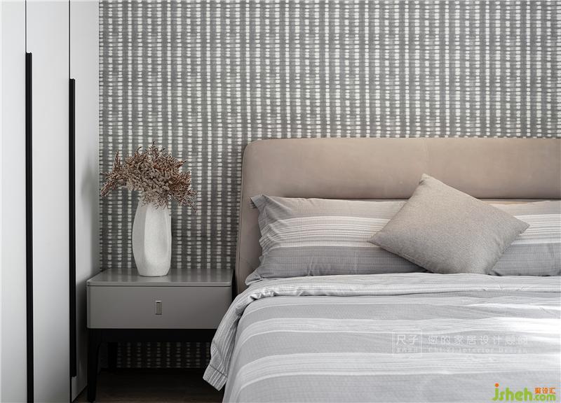 主臥充分考慮到夫妻二人的喜好,優(yōu)雅而克制?;疑舶由熘溜h窗,形成圍合式布局,提升空間質(zhì)感。