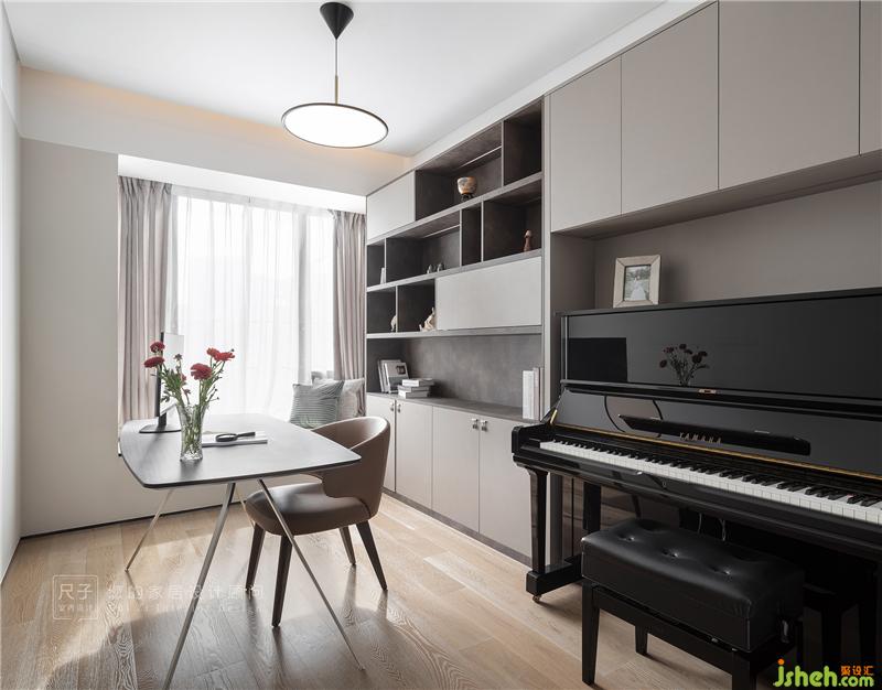 書房進(jìn)門是鋼琴區(qū),再進(jìn)來是辦公的的區(qū)域,一體式的書柜更能保留“書房”整體的感覺。自然光經(jīng)由飄窗進(jìn)入室內(nèi),延續(xù)愜意舒適的氣息。