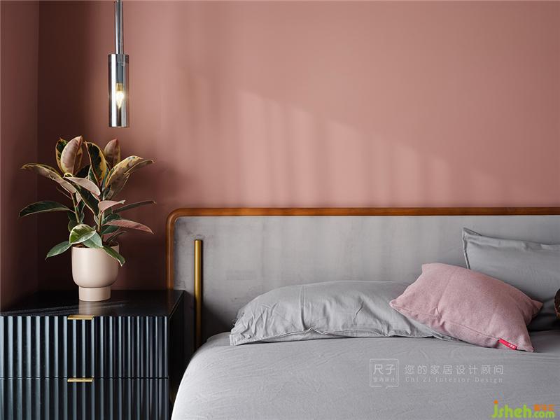 臥室以煙粉作為主色調(diào),煙粉色從床頭向兩側(cè)延伸,形成半圍合的狀態(tài),給居住者足夠的心里安全感;黑白色的穿插又讓大面積的粉色不會過分甜膩。