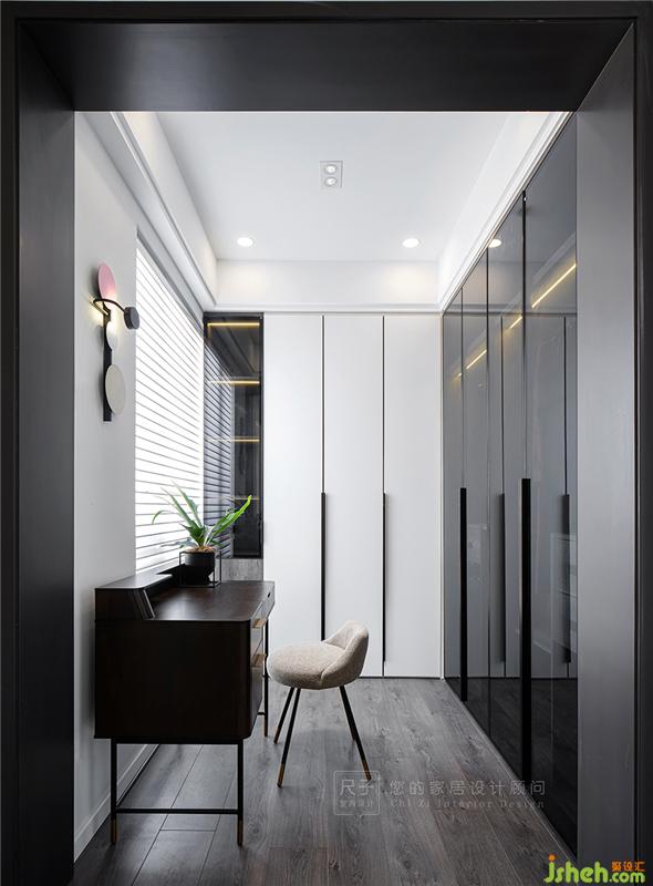 另一側(cè)是小臥室改成的衣帽間,設(shè)計了兩排帶門的收納柜,為了整體通透性,一面柜子選用了黑色半透明玻璃門,簡約不失質(zhì)感。