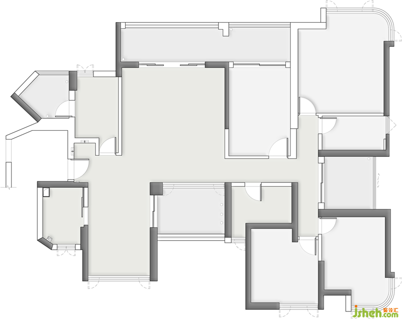 ③放大空間:讓空間盡可能地顯得更大更開闊,這也是業(yè)主的訴求之一,我們將可拆改的墻體完全打開,以通透的長虹玻璃等材質(zhì)打造大空間感
