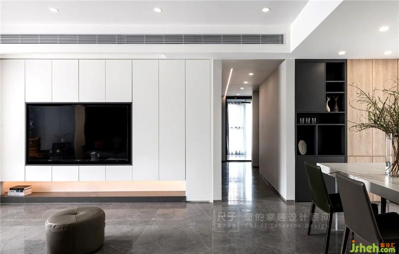①空間融合:公共空間的設計遵循著開放式、一體化的原則,設計師將書房、客餐廳全部打通,維系空間的完整性