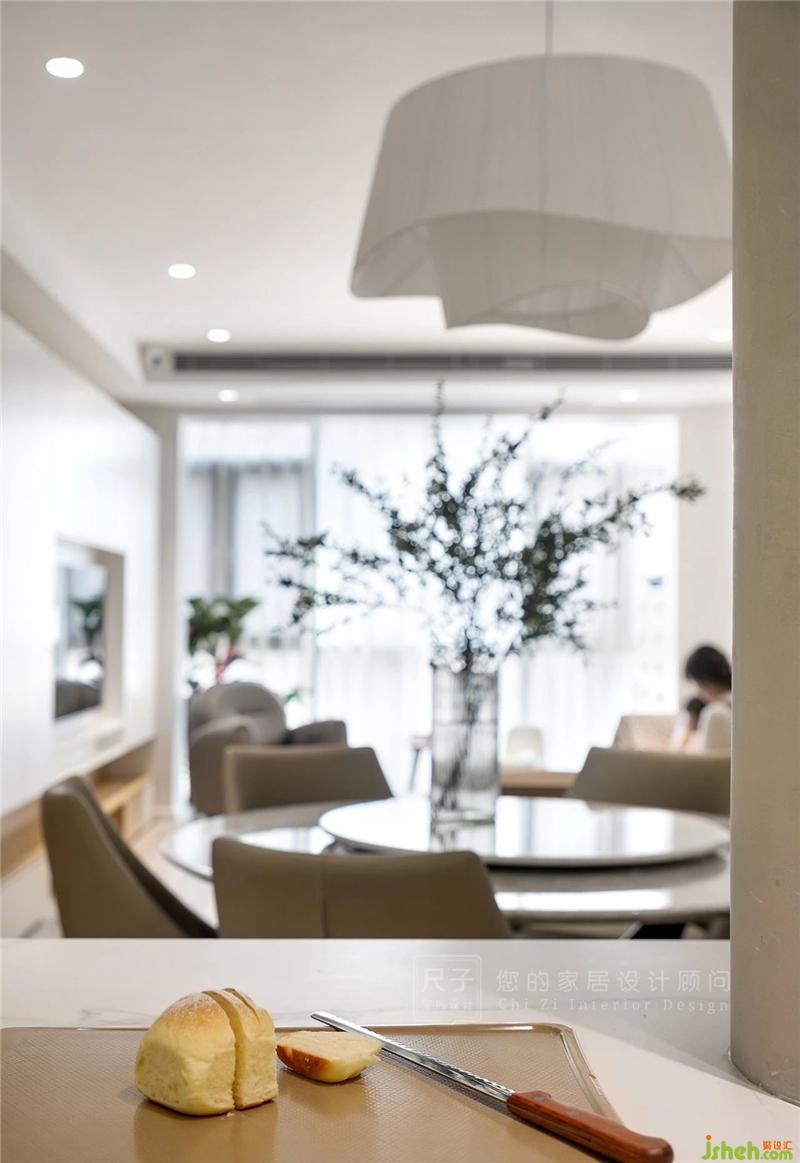 客餐廚一體化的布局,奠定了空間通透明亮基礎(chǔ),一整排橫跨客餐廳的儲物柜,可見這個家的收納能力。