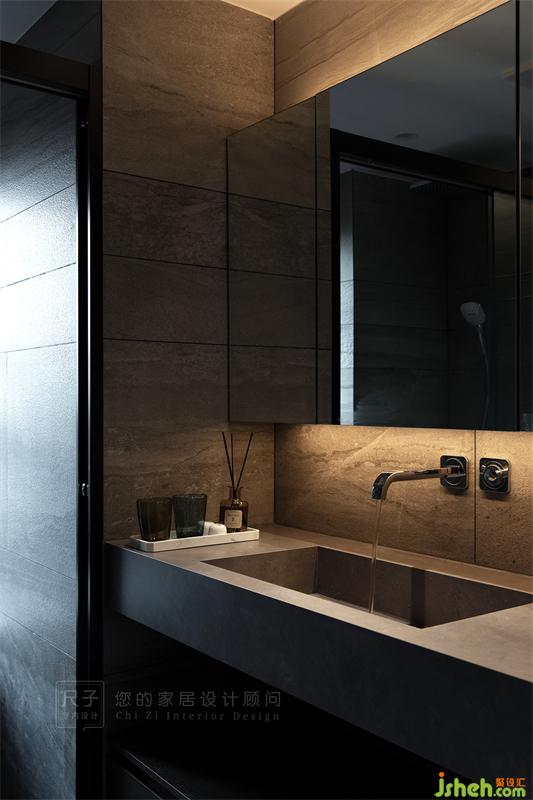 衛(wèi)生間是深色的調(diào)子,砂巖質(zhì)感的瓷磚表面呈沙粒狀,與平滑的巖板臺(tái)面對(duì)比強(qiáng)烈,讓空間立體感更為突出。
