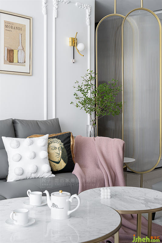 視線穿過圓潤的拱形門洞,金色的邊框與兩扇長虹玻璃組成屏風(fēng)隔斷,影影綽綽中透出一絲客廳的模樣。