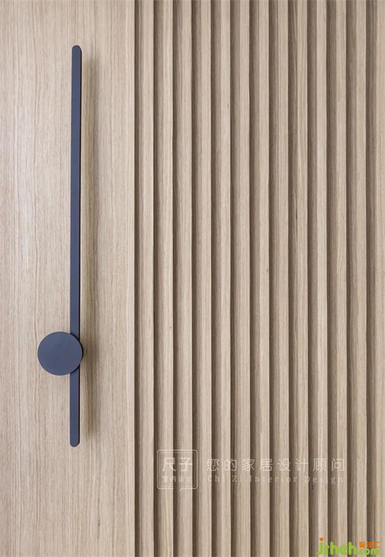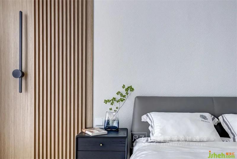 長輩房隱藏在與墻面同色的房門背后,暖白與木色的搭配給人溫暖宜居的感覺。床頭波浪板自帶浮雕般的立體感,無形中化解空間的單調(diào),使居住空間變得靈動起來。