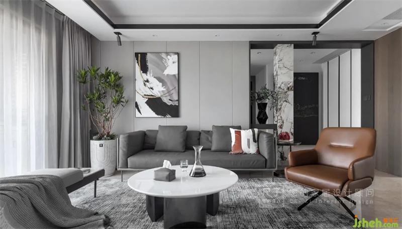 淺色的硬包與深灰色的沙發(fā)形成深淺有致的對(duì)比,棕色的單人沙發(fā)、抱枕加以點(diǎn)綴。