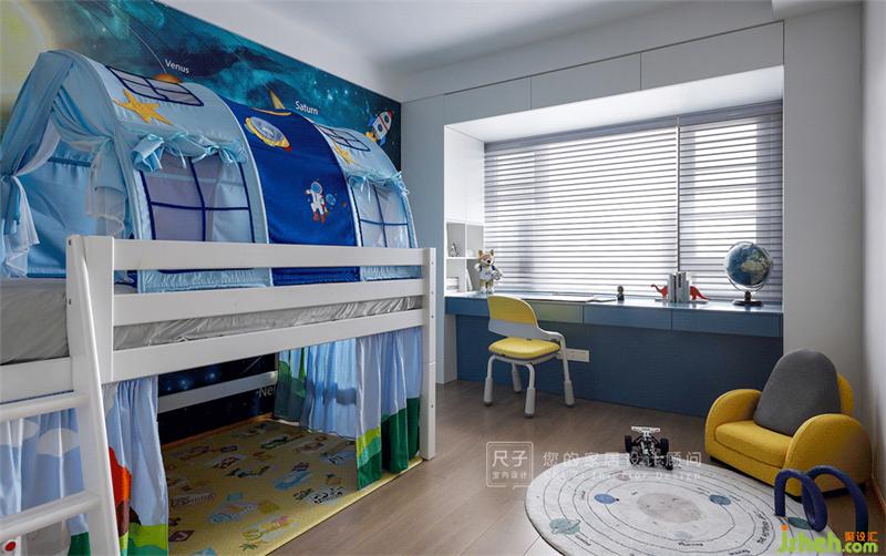 我們更希望展現(xiàn)一個(gè)活力、張揚(yáng)的小孩房,配色上采用藍(lán)色與橙色的對(duì)比碰撞,將原墻面的硬包拆除,換上太空墻紙,增加趣味性。