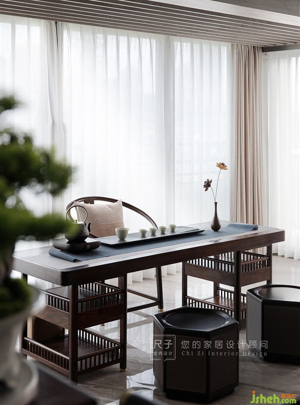休閑陽(yáng)臺(tái)的一部分并入客廳空間作為品茶區(qū),背后是一整面的落地窗,開闊的視野,天然的采光,這個(gè)區(qū)域作為品茶區(qū)無(wú)疑是很好的選擇。