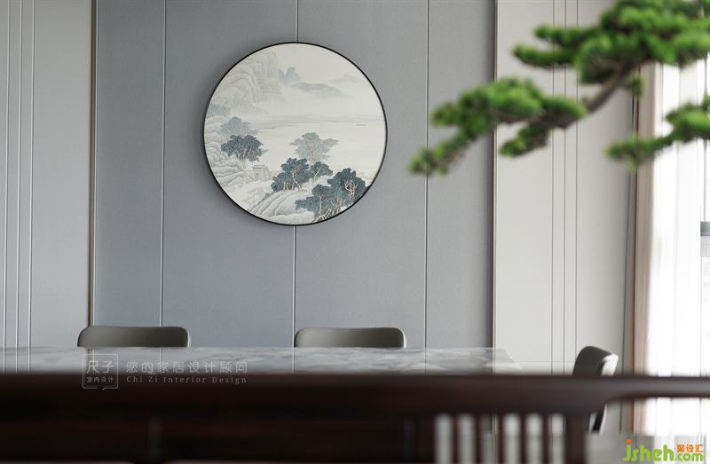 餐廳墻面運(yùn)用疊級(jí)和顏色的變化表現(xiàn)空間的層次感,簡(jiǎn)單的造型給餐廳空間更多的可能性又不會(huì)顯得繁瑣,圓形的裝飾畫將空間表現(xiàn)的更加溫潤(rùn)、典雅。