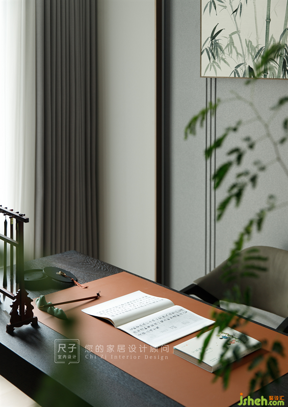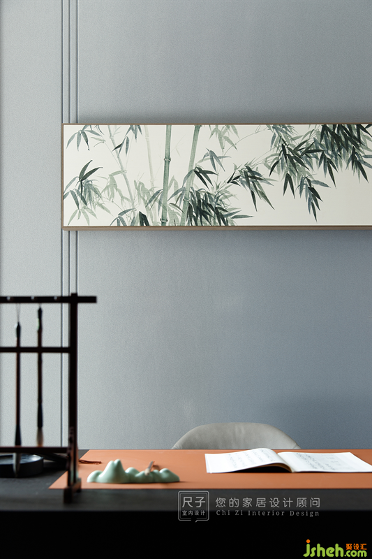 書房與主臥通過推拉門保持聯(lián)系與獨立性,空間動線明確的同時也為室內(nèi)提供了充足的采光。墻上裝飾畫栩栩如生,將大自然的勃勃生機引入室內(nèi)。