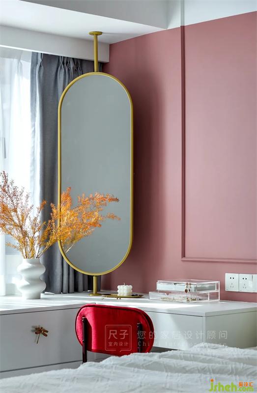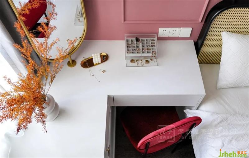 靠窗處將飄窗改為更加實(shí)用的梳妝臺(tái),可旋轉(zhuǎn)的梳妝鏡,縱橫交錯(cuò)的藤編床頭,織就精致又實(shí)用的臥室。