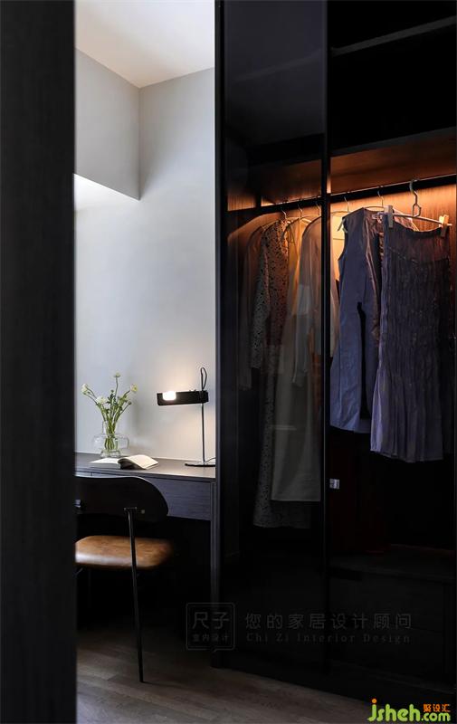 衣帽間定制了時(shí)尚的黑玻衣柜,還利用飄窗臺(tái)做了懸空書桌設(shè)計(jì),將書房的功能結(jié)合起來(lái),這里也是可以隨手翻看書籍的角落。