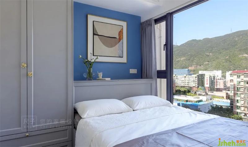 次臥是長(zhǎng)輩的房間,在有限的空間內(nèi),榻榻米床與衣柜很好地滿足了臥室的功能需求。整面落地窗帶來(lái)良好的采光與風(fēng)景,讓原本寧?kù)o的深藍(lán)色添加了一絲清透感,高雅又不缺乏溫馨。