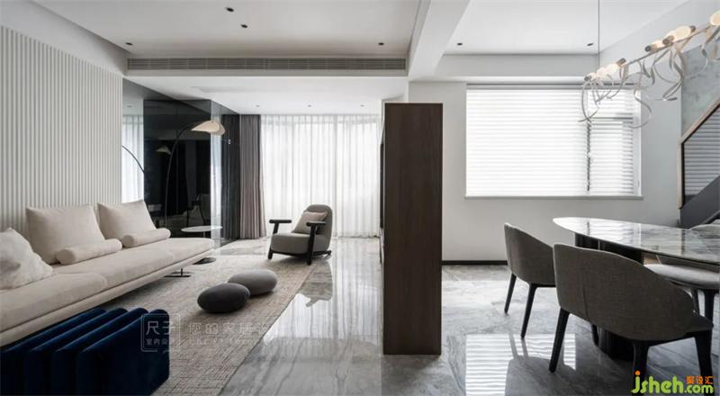 客廳處的陽臺(tái)納入室內(nèi),增加使用面積的同時(shí)也讓光線最大化進(jìn)入到空間內(nèi)。簡(jiǎn)約的大背景下,通過不同材質(zhì)、紋理來豐盈整個(gè)空間。