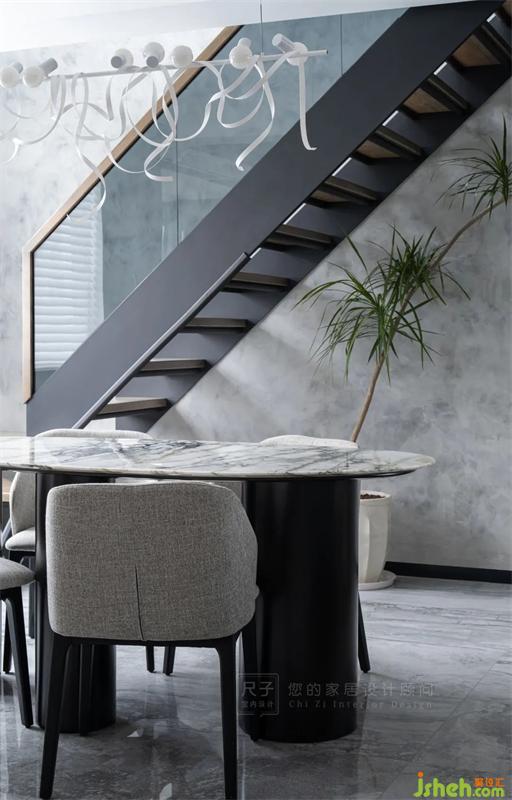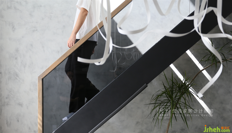 頂樓復(fù)式設(shè)計(jì)樓梯是動(dòng)靜分區(qū)的過(guò)渡地帶,黑色鋼架結(jié)構(gòu)與灰玻的搭配,簡(jiǎn)約亦有質(zhì)感,木色踏板與扶手則展現(xiàn)著空間的溫柔與暖意。