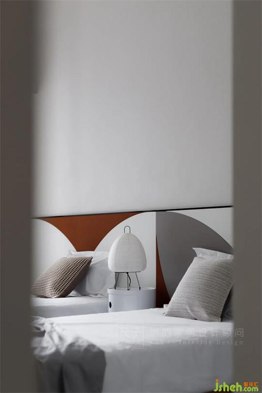 對(duì)于充滿私人屬性的臥室,盡可能貼合居住者的個(gè)性。于是有了以不規(guī)則的幾何色塊裝飾的床頭背景,讓小孩房顯得更加靈動(dòng)活潑。