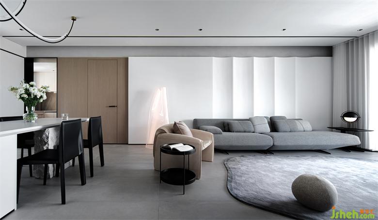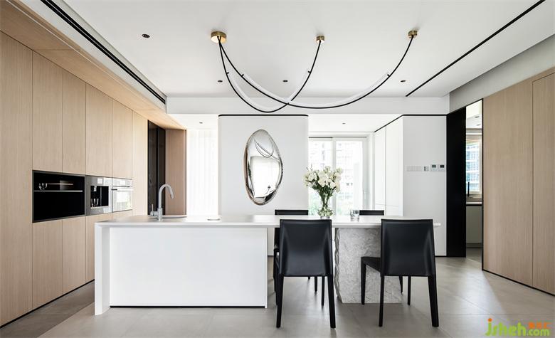 餐桌與吧臺(tái)一體,純白色的巖板桌面下是天然的石頭支撐,足夠長(zhǎng)的臺(tái)面,深圳家裝設(shè)計(jì)豐富了原本單一的功能屬性,整排儲(chǔ)物柜則滿(mǎn)足了公共區(qū)的收納需求。