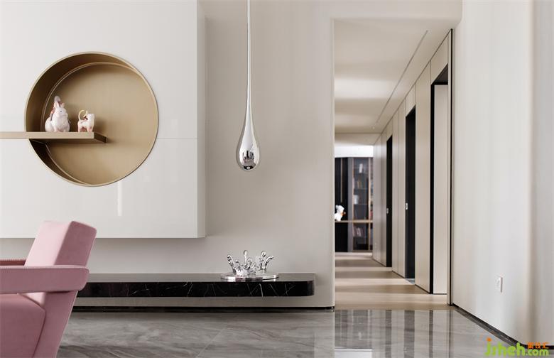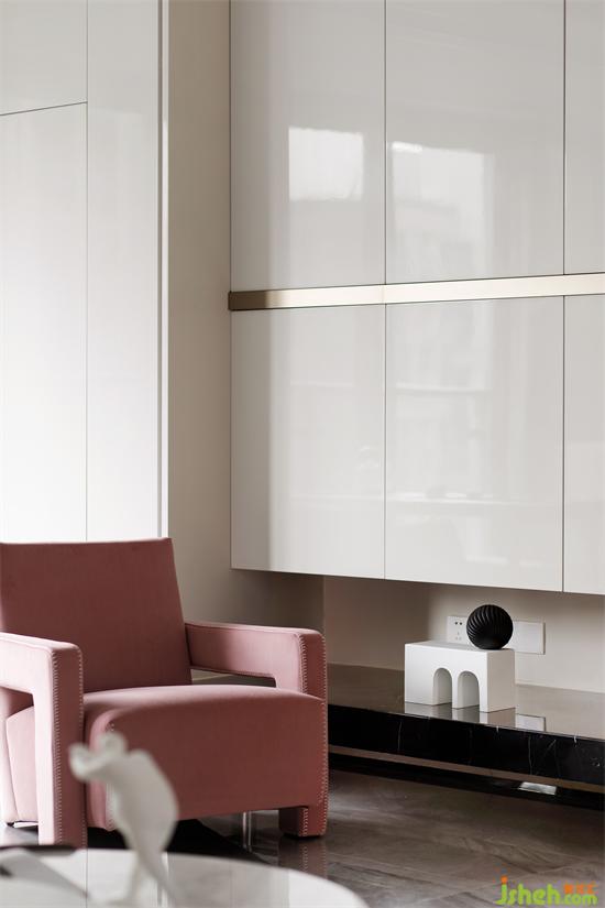 客廳儲物柜兼顧儲物和造型感,橫線條猶如人生的翹翹板,是這個家支撐了兩個小女孩的成長。深圳家裝設(shè)計白夜童話小女孩擺件、水滴的裝置、單人位沙發(fā)一粉一藍的搭配,餐廳的雙環(huán)鏡子、都圍繞其中。