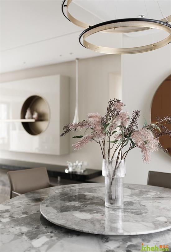 弧形線條遵循一定韻律延伸至餐廳,圓形元素在家具配飾上的運用,深圳家裝設(shè)計讓整體氛圍清冽的餐廳多了絲絲柔和的感覺。