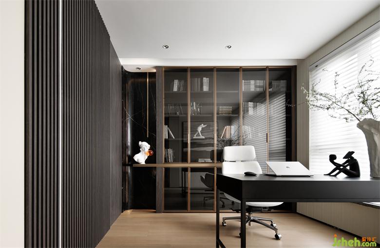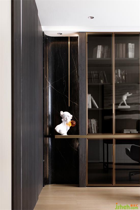 深色系的配色讓視覺從客廳背景的黑色地臺延伸到書房,深圳家裝設(shè)計通過統(tǒng)一深度、不同材質(zhì)和分割手法的變化,大理石、玻璃、木材、啞光不銹鋼的肌理詮釋出空間的純粹、精致,以及書房沉穩(wěn)的氛圍。