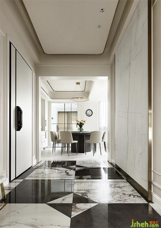入戶豎廳的布局,玄關(guān)在客餐廳光線的暈染下,黑白瓷磚、巖板、金屬,在奶油色的基調(diào)中,呈現(xiàn)華麗且溫和的氛圍,法式線條元素結(jié)合,切實(shí)演繹精致與優(yōu)雅。