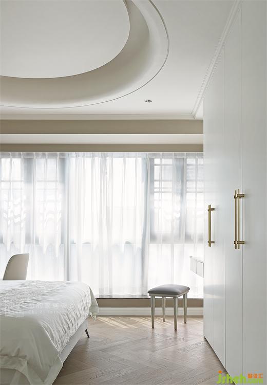 主臥以雅致為主調(diào),吊頂造型形成視覺張力,法式線條帶來(lái)精致優(yōu)雅氛圍的同時(shí),深圳裝修設(shè)計(jì)拉伸了空間的高度;局部的金屬材質(zhì)運(yùn)用也增加品質(zhì)感。
