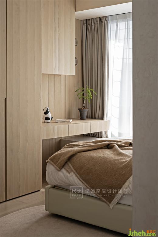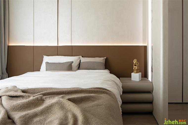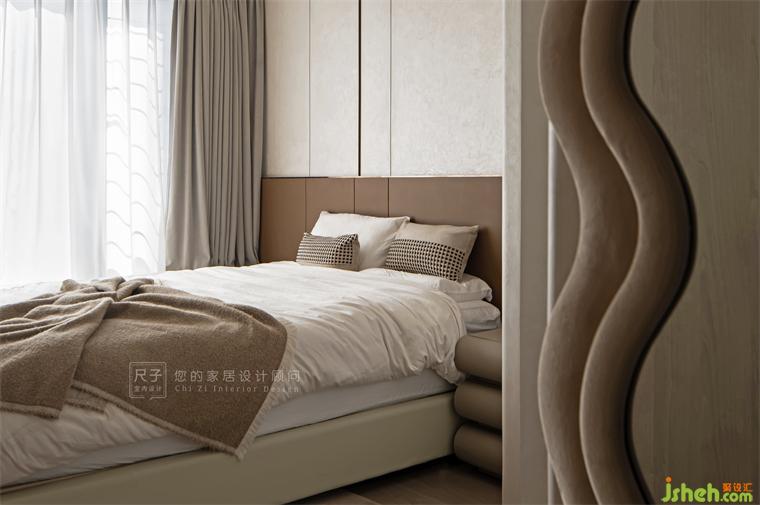 主臥半隔斷巧妙成為兩處區(qū)域的間隔點,騰出更多的活動空間,又保證隱私的尺度;裝修設計吊頂弧形的設計通過藝術(shù)涂料的自然紋理,打造空間的流動質(zhì)感。