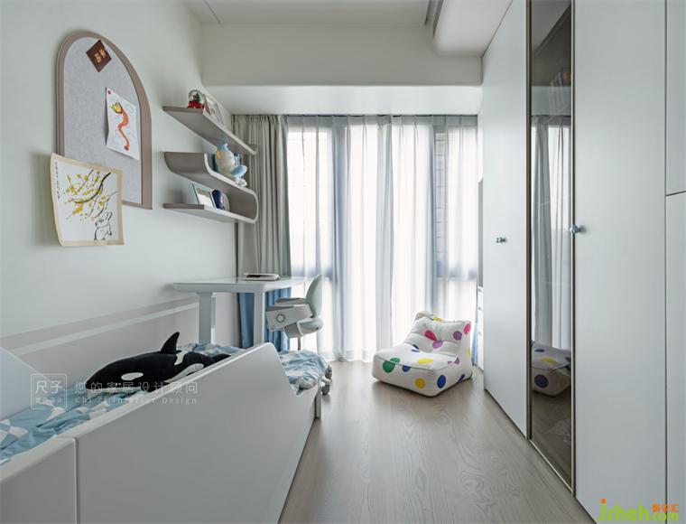 各個空間有各個空間的設計風格,男孩房不僅有睡眠學習區(qū),還有攀巖、攀爬架的設計,滿足小男孩好動活潑的性格;女孩房充滿儀式感又有寬敞的活動空間。