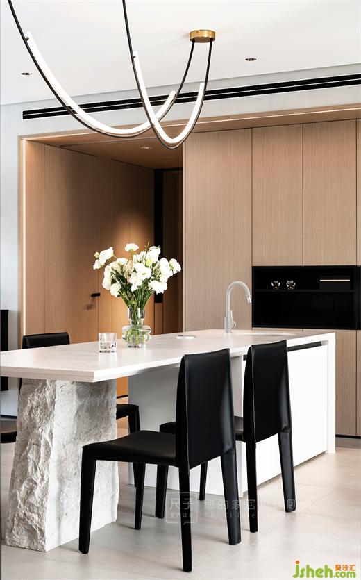 餐桌與吧臺一體,純白色的巖板桌面下是天然的石頭支撐,足夠長的臺面,家裝設(shè)計(jì)豐富了原本單一的功能屬性,整排儲物柜則滿足了公共區(qū)的收納需求。