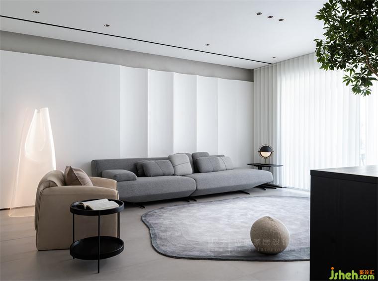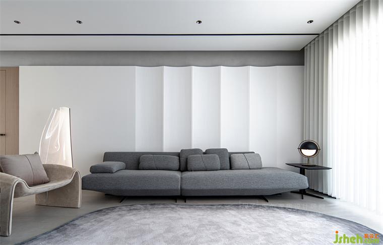 屋主希望家里是開(kāi)闊通透的,于是便舍棄了笨重的茶幾,以一塊不規(guī)則造型的地毯,圈出適合孩子玩樂(lè)的“安全區(qū)”。