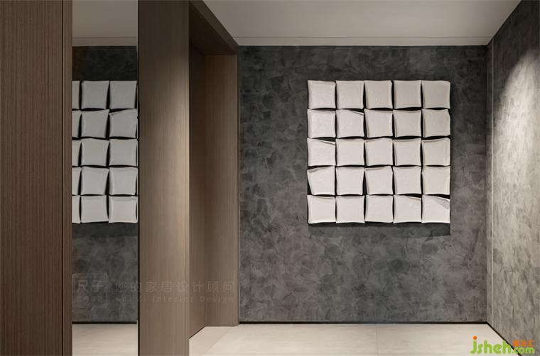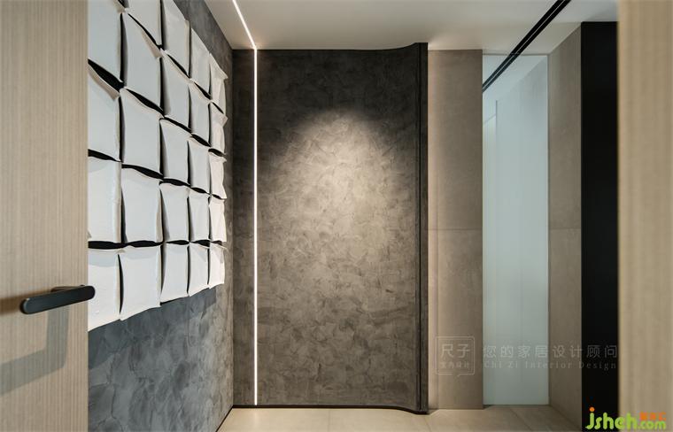 獨(dú)立的內(nèi)玄關(guān),保證了相對(duì)私密的空間界定,以及居住的儀式感。墻面嵌入了磨砂玻璃,以此改善內(nèi)玄關(guān)與主衛(wèi)的采光。