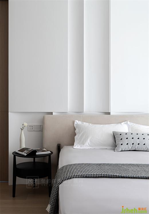 主臥睡眠區(qū)以溫馨、寧靜為基調(diào)。木色與白色的搭配簡單卻經(jīng)典,床頭背景是與客廳同款的波浪板,公區(qū)與私區(qū)既分割又不缺乏聯(lián)系。