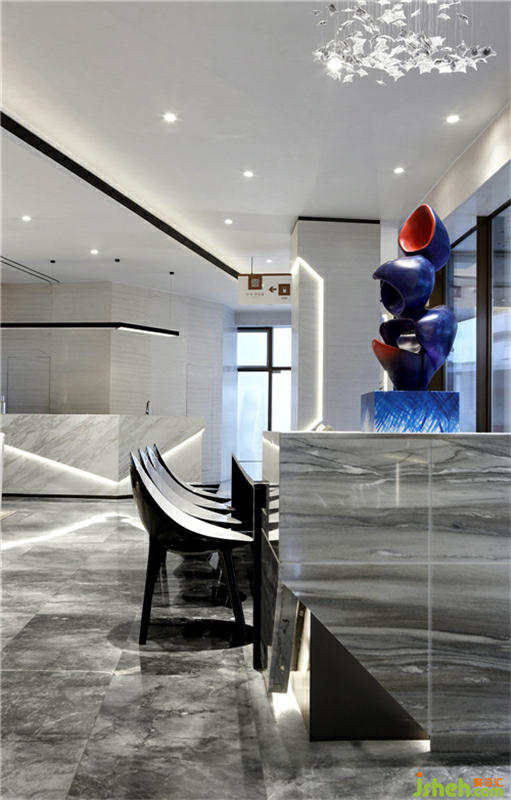 天花與接待臺(tái),依然沿續(xù)“折”的理念,通過(guò)線條折疊,在直線與曲線構(gòu)成的光影之中,光線在空間中不經(jīng)意地流轉(zhuǎn),將時(shí)間與空間融為一體。裝修公司