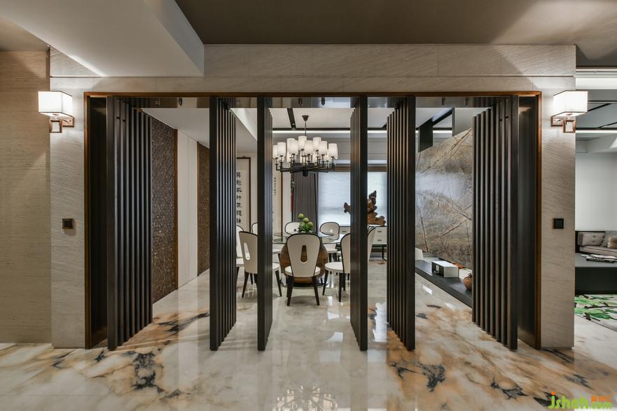 一進門的玄關適度的開放尺度,跳脫刻意分割或制式高櫃的思考,在平面規(guī)劃階段,就善用佛堂隔間催生隱藏式衣帽間,並將大門到餐廳格柵間的開放區(qū)域規(guī)劃為品茶區(qū),讓第一眼的目光即能享受深邃且轉(zhuǎn)折分明的環(huán)景之美。室內(nèi)設計師