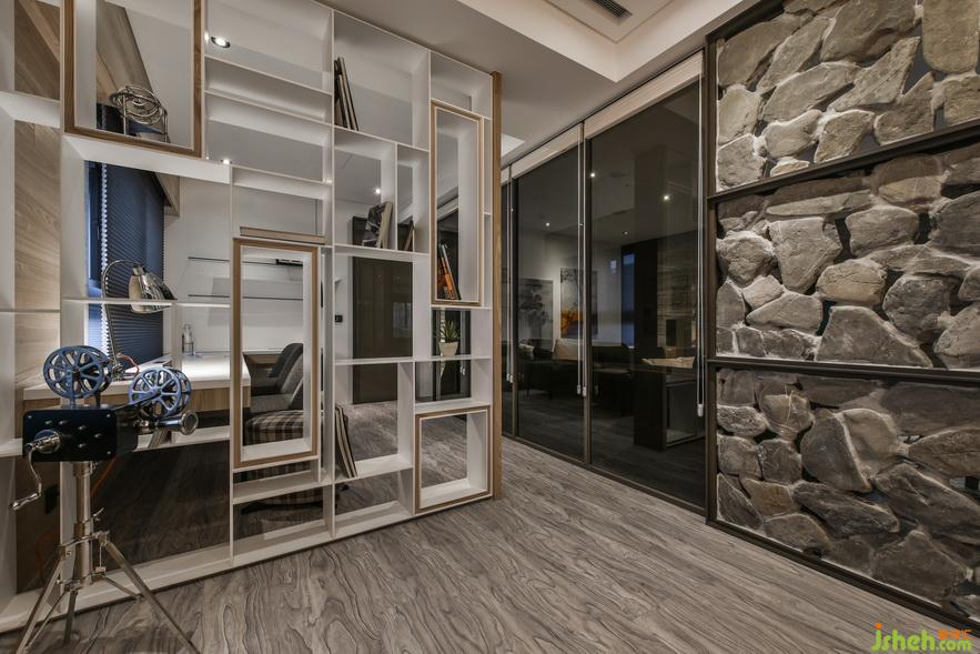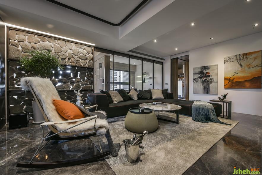 空間演譯:利用巖盤的不規(guī)則性拼貼成蜂巢結(jié)構(gòu),以六角模矩為單位,組構(gòu)成氣孔牆,讓外牆的光線再一次透過巖盤空隙,灑落到居室空間,煙燻木紋的染色性,如同大雪覆蓋後的植披,隱約的表露極地的冰冷感.室內(nèi)設(shè)計師