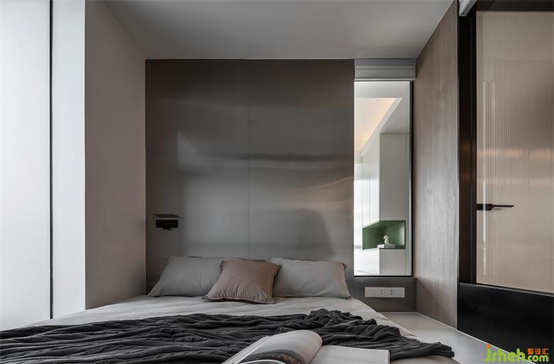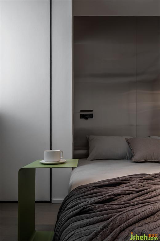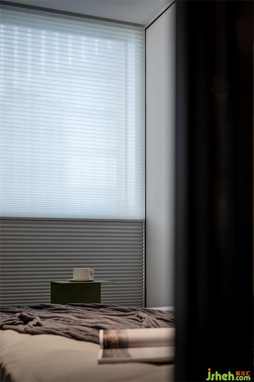 臥室顏色以白、灰為主臥室背景墻面采用拉絲不銹鋼的反光材質(zhì),既是一種裝飾,也能呼應(yīng)金屬的現(xiàn)代摩登,與現(xiàn)代簡(jiǎn)約風(fēng)格形成強(qiáng)烈視覺反差。同時(shí)我們將主臥室與兒童房之間做了一扇窗,既可以增加主臥的采光,又可以讓父母第一時(shí)間關(guān)注到孩子的成長(zhǎng)與安全。隨著孩子慢慢長(zhǎng)大并對(duì)隱私性有要求的時(shí)候,我們也貼心的將這扇窗增加了蜂窩百葉功能,隨時(shí)隨地根據(jù)居者需求調(diào)整光線及隱私。