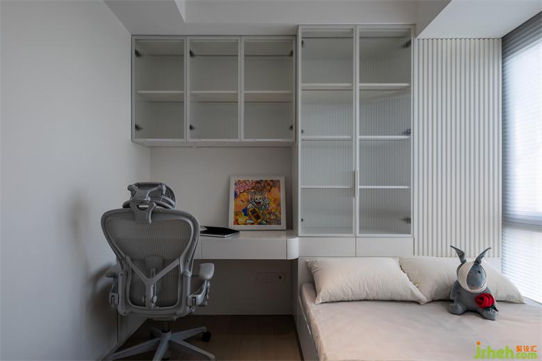 次臥——集休息與學習于一體,獨屬于孩子的安靜空間。天津和平翰林公館裝修設計搭配柔和色調的床品等軟裝布置,營造出舒適安逸的氛圍。超大獨立儲物柜,方便收納,不顯凌亂~