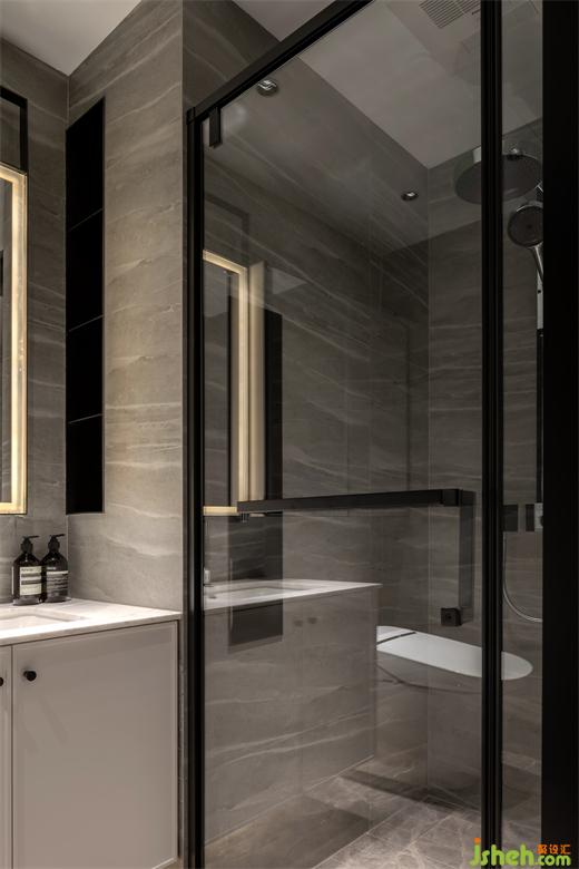 洗浴池上方嵌入方形鏡,周圈一抹亮光,與整體風(fēng)格相搭配,營(yíng)造出輕奢優(yōu)雅的氛圍感。燈光與金屬碰撞的浪漫光感,不同材質(zhì)的同聲表達(dá)流露出的氤氳觀感,凸顯國(guó)際范兒。