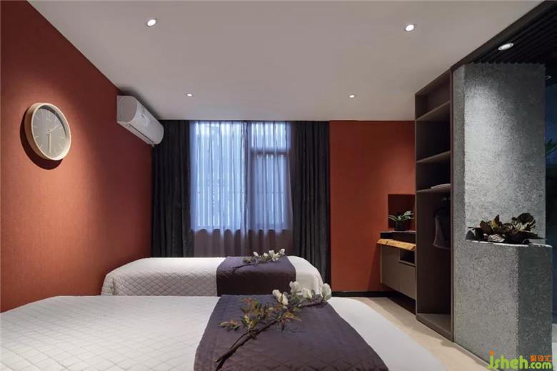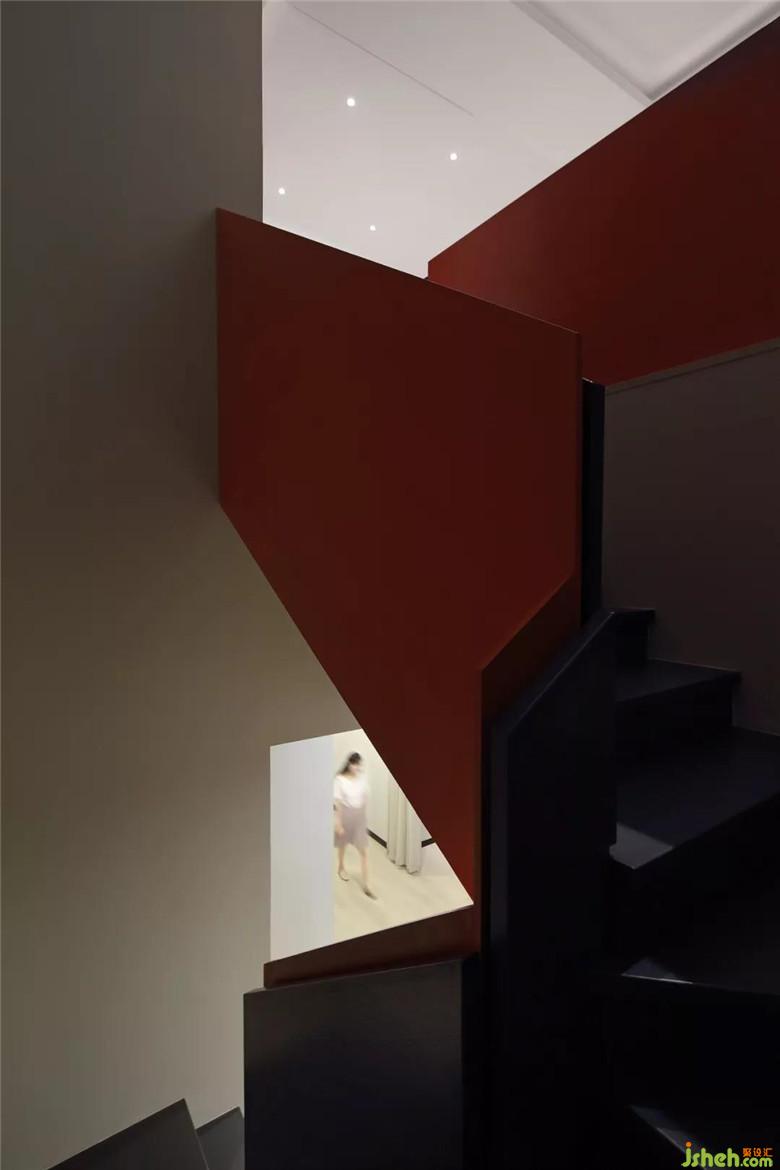 舍去傳統(tǒng)的欄桿扶梯,紅黑搭配的樓梯是樓下樓上色系的銜接色,為樓上房間的色調做了完美的鋪墊。
