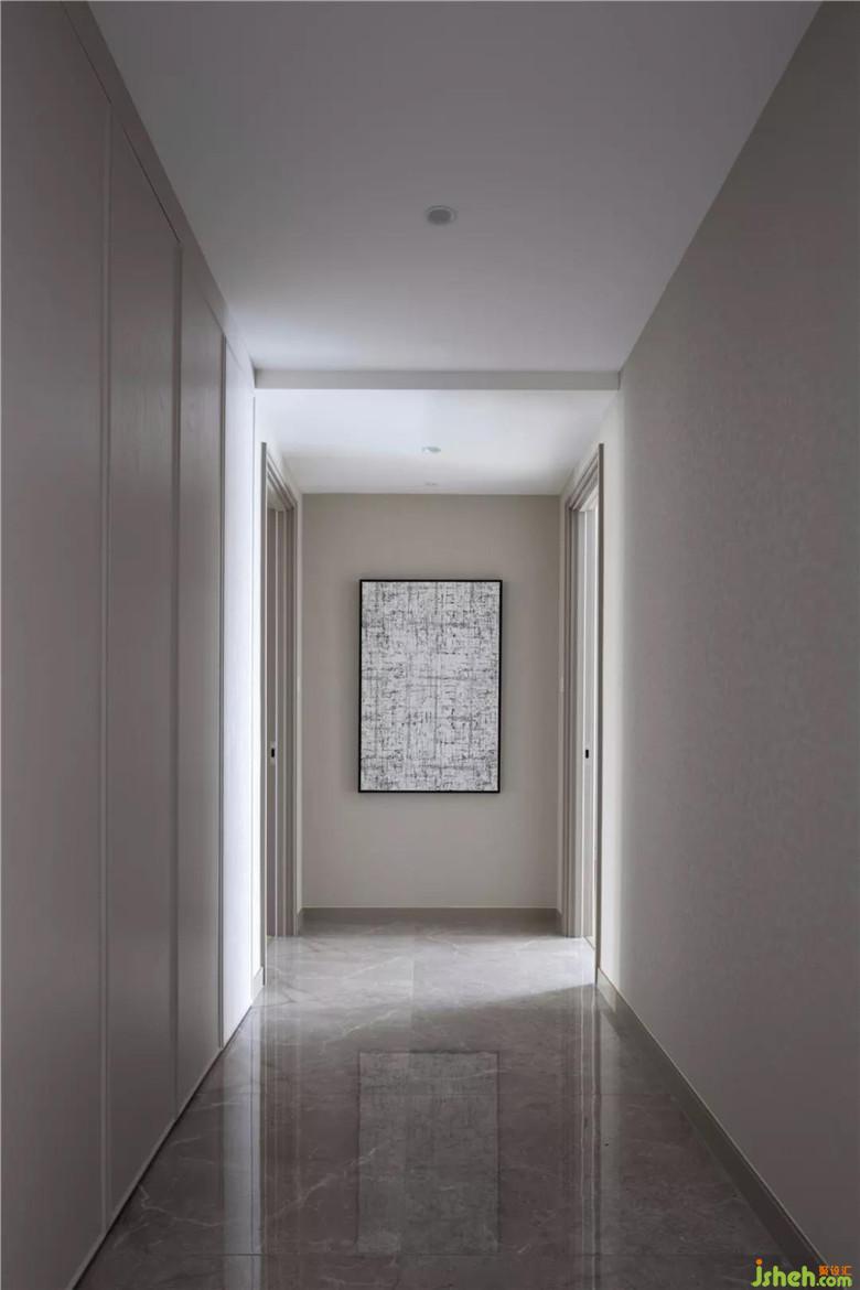 餐桌旁頂天立地的儲物柜,與一旁的電視背景墻隔著走廊相互呼應。露出的展示區(qū),完美平和了單調(diào)感,等待被擺上生活的印記。