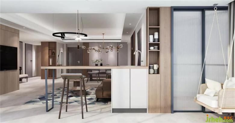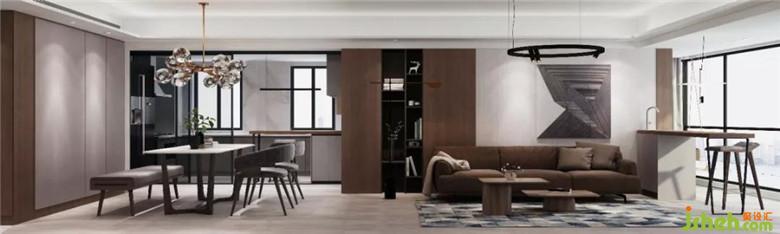 開放式的空間、簡約的造型,撫去都市里的繁雜。大面積的木飾面將空間氛圍烘托得自然愜意,用暖灰色為主色調(diào),創(chuàng)建溫暖又高級的視覺感受。裝修公司