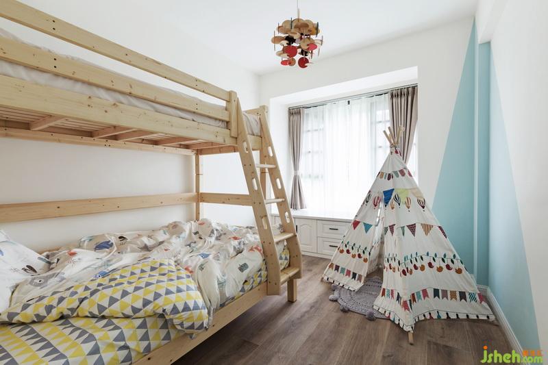 兒童房在施工中途得知這個家庭即將迎來第二個小生命,所以床換成高低床滿足所需;基礎(chǔ)色也以中性色為主色調(diào),室內(nèi)設(shè)計師采用清新的天空藍撞入空間。利用轉(zhuǎn)角墻體進行色彩插入;配合玩耍小帳篷讓兒童房增添一些童趣和玩味性。