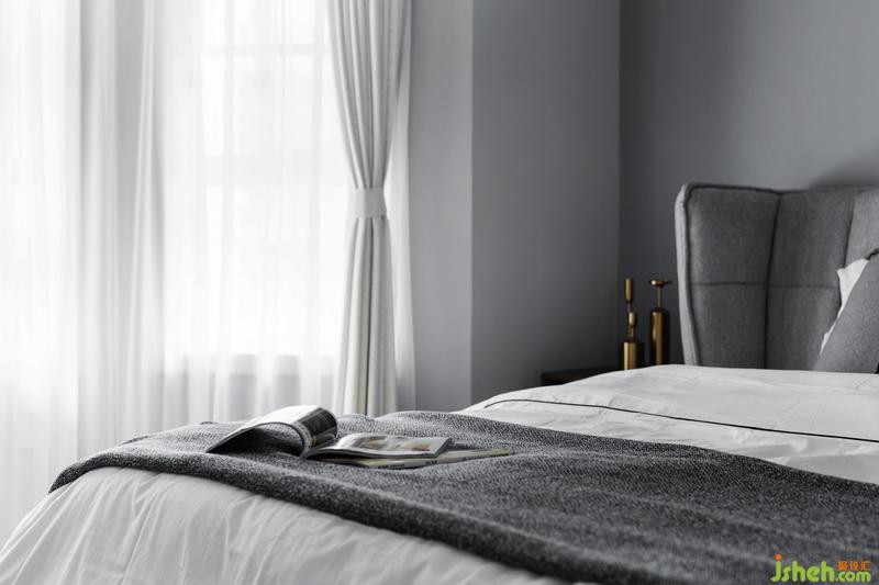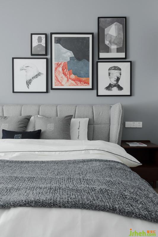 主臥好比一曲爵士樂;灰色層次是它的節(jié)拍,組合掛畫、金屬吊燈、梳妝桌椅隨著節(jié)拍即興搖擺,靜靜感受這種律動帶來的儀式感。