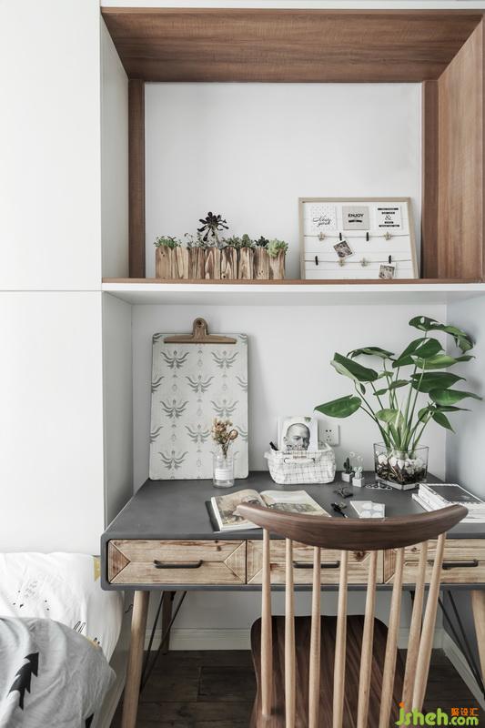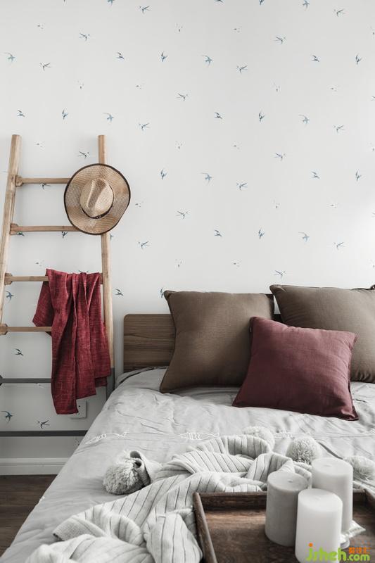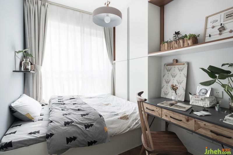臥室走的是北歐日式感,更靜謐,水泥頂拉伸了整屋層高,室內(nèi)設(shè)計師選擇高箱床增加了儲物空間,將原飄窗位結(jié)合做榻榻米床,兼?zhèn)鋬ξ锱c睡臥的使用