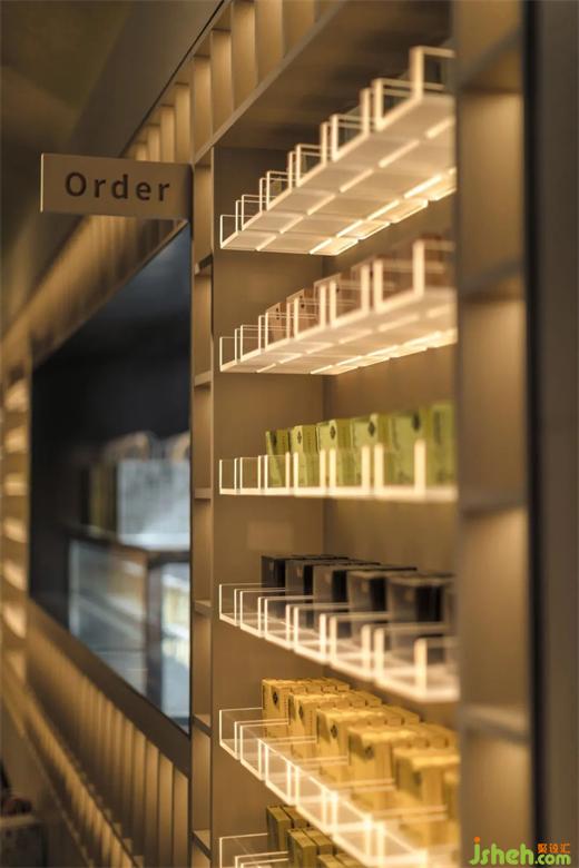 門口的抱柱櫥窗和室內(nèi)墻面展示架內(nèi)部的折面,均來源于東方的“折扇”這一元素。旗艦店設(shè)計(jì)進(jìn)入空間內(nèi)部,映入眼簾的便是陣列感十足的茶品展陳架。CUN用一種連貫的手法統(tǒng)籌所有立面,使同一材質(zhì)和表現(xiàn)元素貫穿始終,其中更加入了“亞克力U形架”等獨(dú)有設(shè)計(jì),讓整個(gè)空間立面在統(tǒng)一、震撼且純粹的基礎(chǔ)上,多了一份變化與不同。