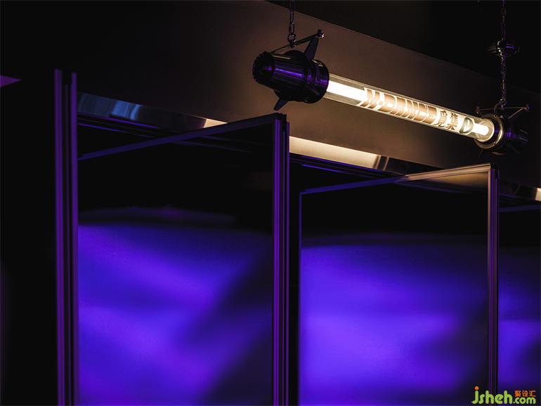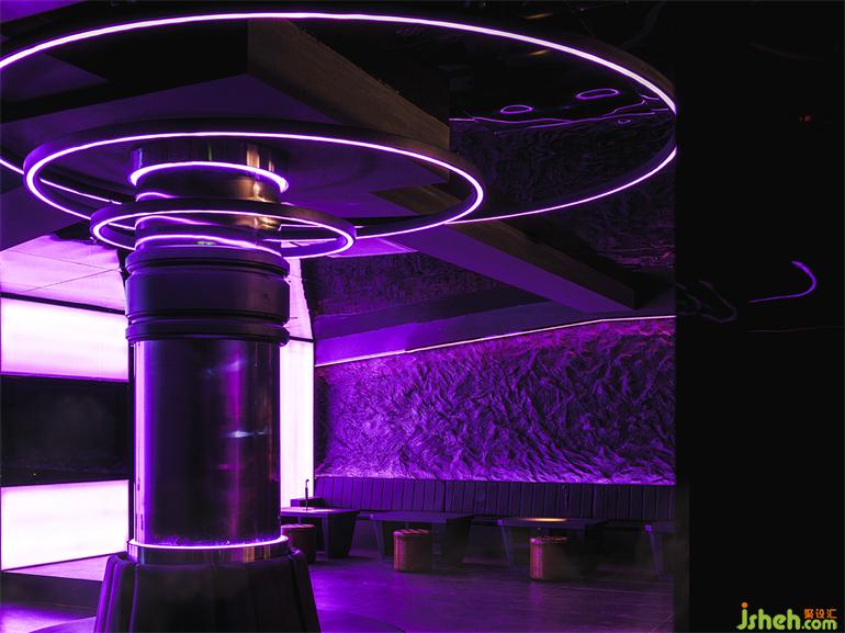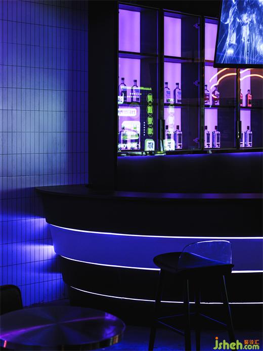 吧臺(tái)區(qū)的LED燈帶利用動(dòng)態(tài)的數(shù)字內(nèi)容快速提升空間氛圍和娛樂(lè)趣味,作為點(diǎn)綴的金屬構(gòu)架在霓虹燈的映照下,俱樂(lè)部設(shè)計(jì)帶有來(lái)自未來(lái)的機(jī)械美感。部分吧臺(tái)主體采用玻璃磚堆砌而成,平衡了輕盈與厚重之間的美感,將霓虹光吸納其中。