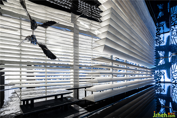 When stop andlook up,visitorswillfind outthe geometric objects irregularlydistributed in space. They are either suspended, inverted, or attached, sometimes reflecting the sparkling water, sometimesshining uponthe changing lines, just like the cliffstone in the canyon.They are the littlesubtleties that existdistinctlyin the great majesty.