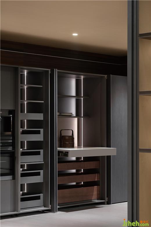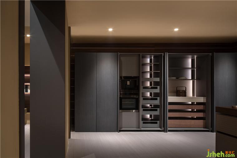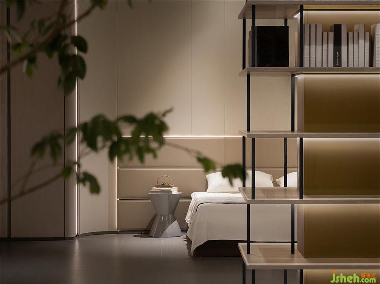 入內(nèi),多元的品質(zhì)化生活場景徐徐展開,光影流轉(zhuǎn),移步換景,衣柜、博古柜、隱形門,墻板展示等與空間進行有效融合,細節(jié)質(zhì)感考究。全屋定制展廳設(shè)計通天書柜尤為出彩,即為隔斷,在藏與露之間營造多層次的透視關(guān)系,又在視覺上與弧線寰宇框架成交錯狀態(tài),提供豐富的線條變化。