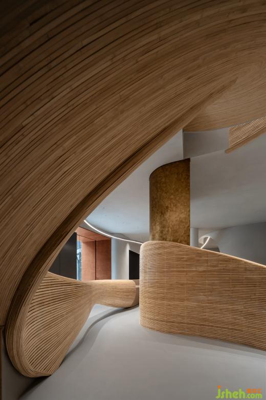 辦公室設(shè)計(jì)細(xì)竹木編織而成的接待前臺(tái)猶如掀起的巨浪,繼續(xù)纏繞著旋轉(zhuǎn)樓梯,如漩渦一般,蜿蜒攀升至二樓。